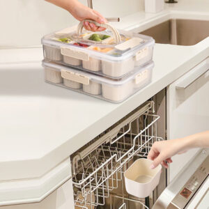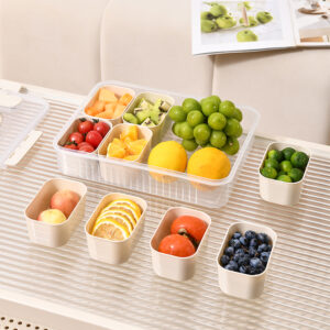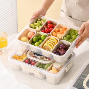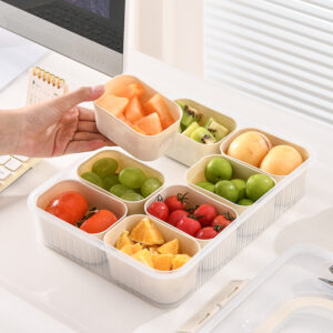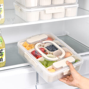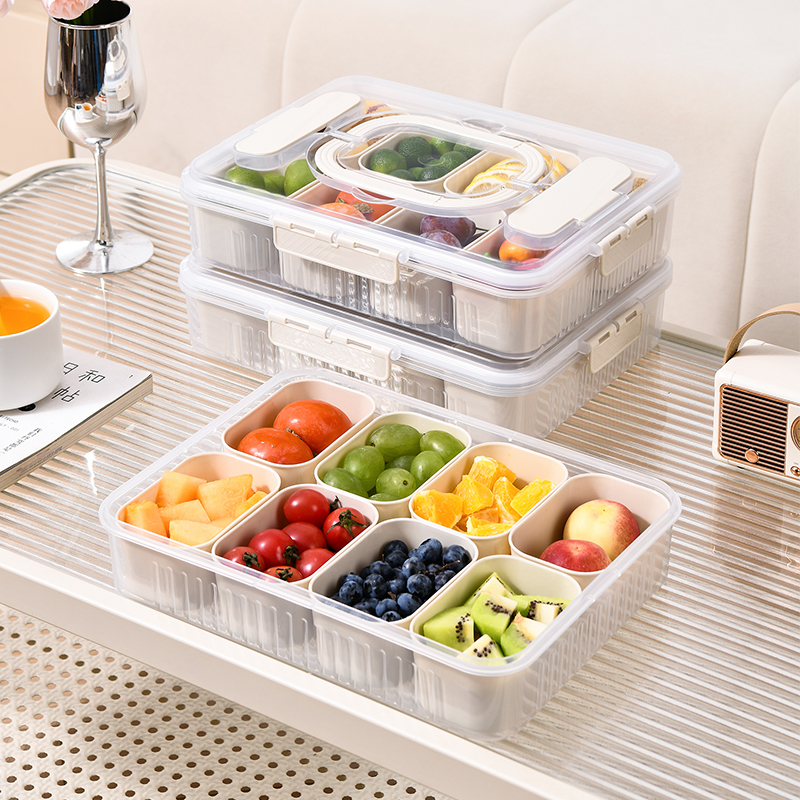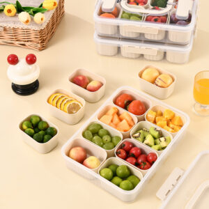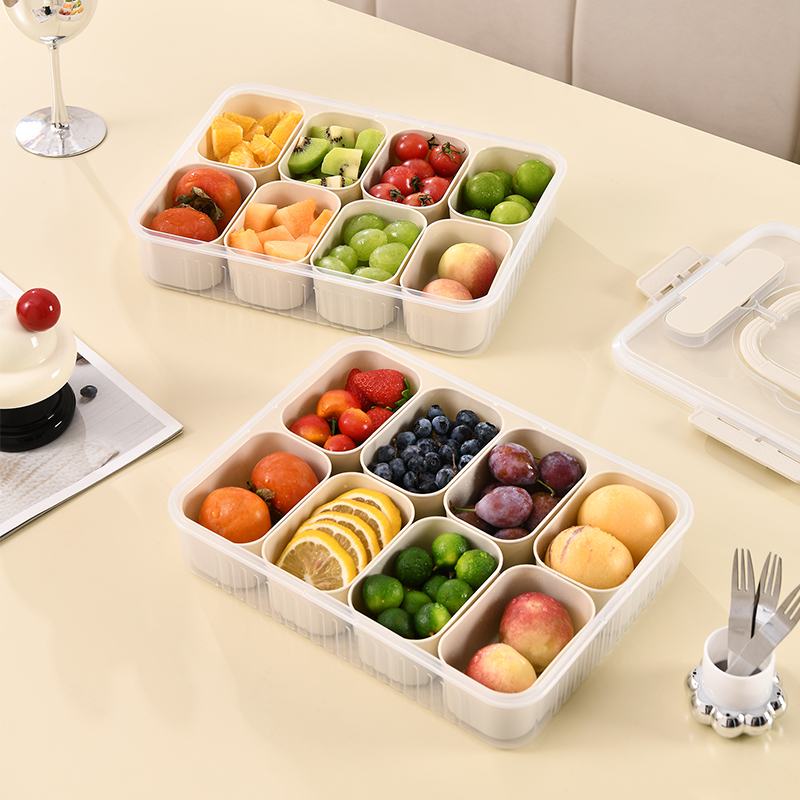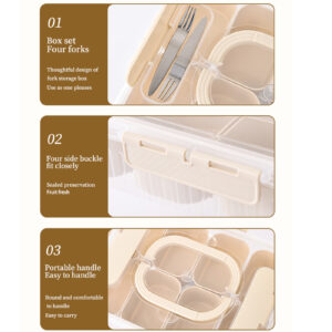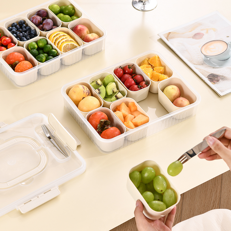1 portable multi compartment box, containing 8 small compartments, 4 forks, covered plastic food tray, stackable fruit and vegetable containers, 8 detachable mini boxes for storing snacks, salads, candies